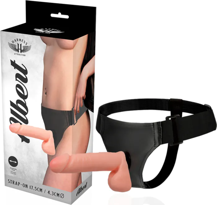 Experience versatile play with the Harness Attraction Albert. This realistic harness offers a comfortable fit and a distinctive click system for interchangeable dongs, great for both men and women.