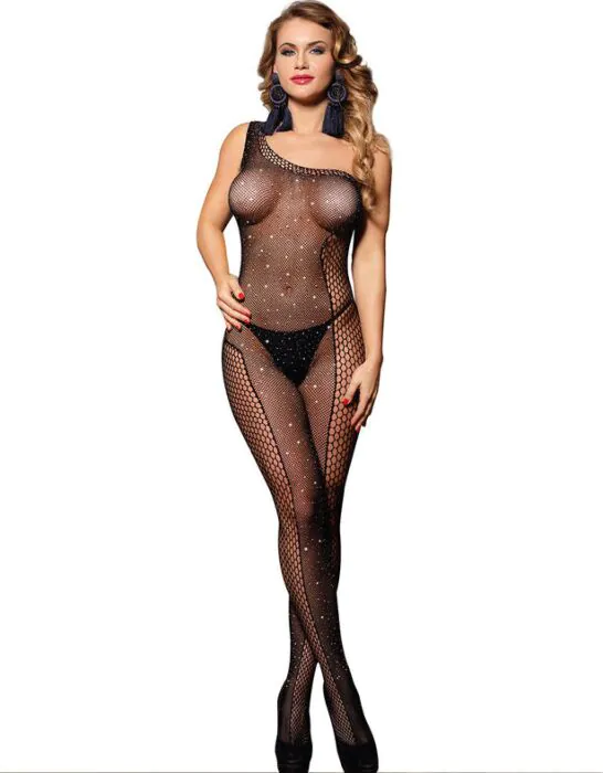 Senzualnost in eleganca se združita v tem črnem bodystockingu iz mrežice, okrašenem z diamanti. Njegova asimetrična zasnova in enostranski ramenski trak poudarjata postavo ter dodajata pridih luksuza za posebne trenutke.