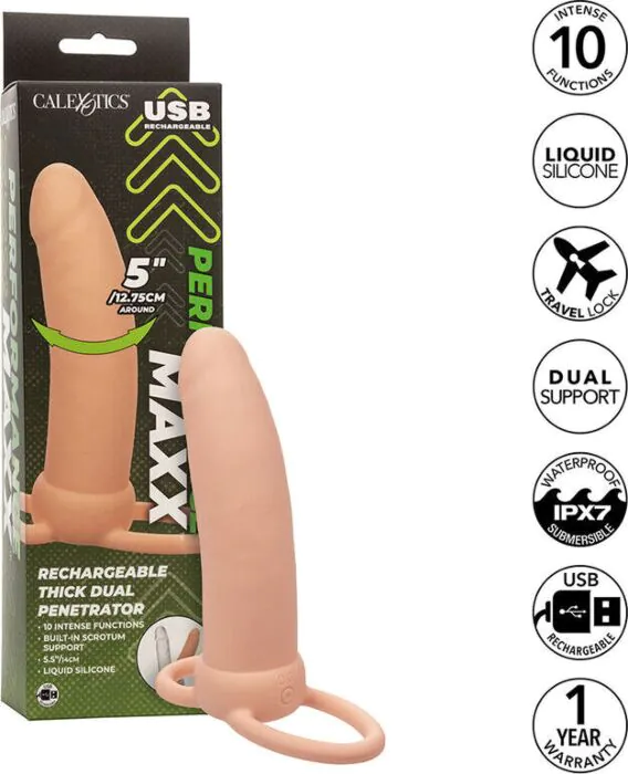 Intenzivno doživetje dvojne penetracije z debelim dizajnom in 10 načini vibracij. Extensor CALEXOTICS Maxx je izdelan iz tekoče silikona, kar pomeni, da je prijeten na dotik in vzdržljiv. Z vodoodpornim kakovostjo (IPX7) ga lahko uporabljate tudi v vodi za še več zadovoljstva.