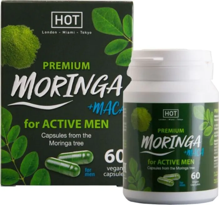 Povečanje moči in vitalnosti z naravno mešanico Moringe BIO in Mace. Kapsule HOT Moringa Men so polne vitaminov A, B, E in K, ter omega maščobnih kislin 3, 6 in 9. Te rastlinske kapsule zagotavljajo naravno formulo brez kemikalij.