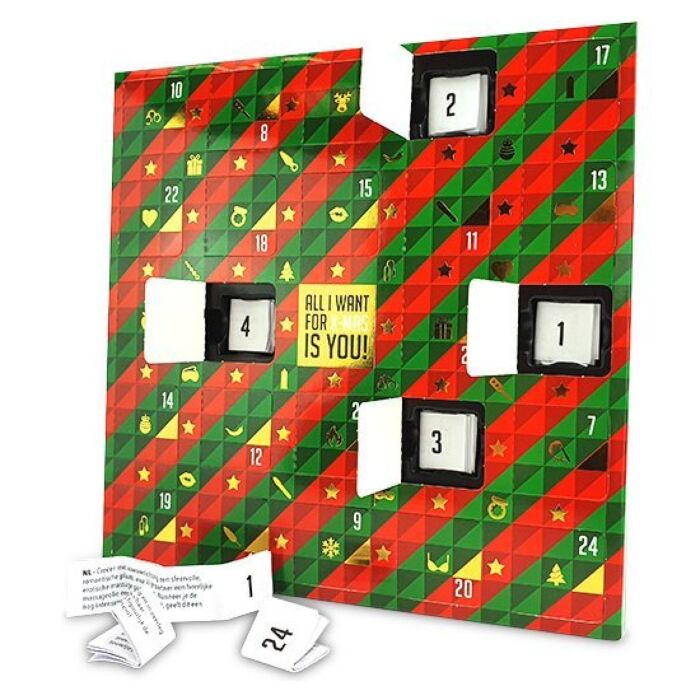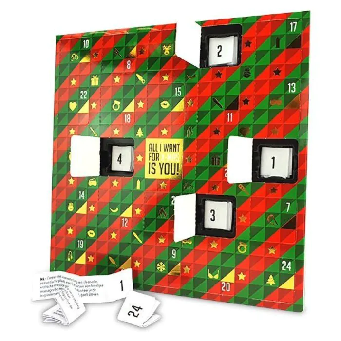 Pripravite se na praznični mesec, poln vznemirjenja in intimnosti! Ta koledar prinaša 24 erotičnih izzivov, ki bodo vzbudili strast in dodali zabavno noto vašim skupnim trenutkom. Vsak dan odpremite novo vrata in odkrijte, katero presenečenje vas čaka. Izbirajte med masažami, igrami vlog ter drugimi zabavnimi nalogami, vse to pa v 10 različnih jezikih.