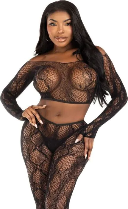 Poudarite svoje obline in se počutite samozavestno v tem seksi kompletu, ki kombinira top z dolgimi rokavi in visokimi legicami. Material, sestavljen iz 95% najlona in 5% elastana, se nežno prilega vašemu telesu in zagotavlja udobno nošenje. Vzorčenje kačje kože doda privlačen in zapeljiv pridih, ki vas bo naredil vidno privlačno.