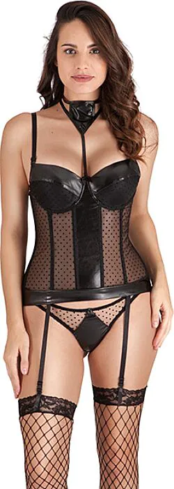 Ženstvenost in drzen videz sta združena v tem nenavadnem kompletu. Bustier z ligirjem natančno prilega, hkrati pa omogoča udobno nošenje. Zajemajo ga tkanine z vzorcem pikic in usnjenimi detajli, kar ustvari čudovit kontrast. Ta komplet vas bo zagotovo očaral.