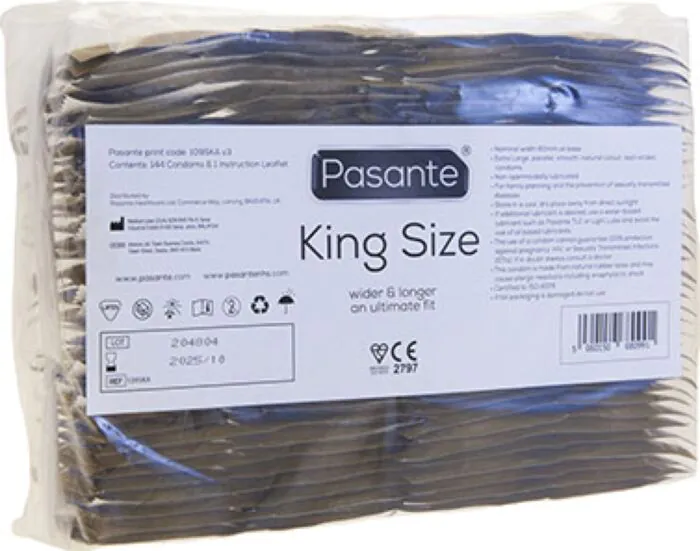 Kondom Pasante King Size je zasnovan za moške, ki iščejo več prostora in udobja med uporabo. Njegova velikost 60 mm zagotavlja udobno prileganje pri večjih debelinah.