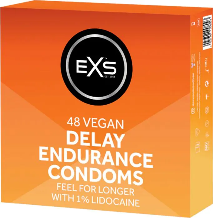 Učinek zaviranja med spolnim odnosom s pomočjo kondomov Exs Delay 48s zagotavlja daljše uživanje. Ti kondomi z lidokainom zmanjšujejo občutljivost, kar pomaga pri prolongaciji ejakulacije. Premazani so s silikonol in imajo prijetno, prozorno in udobno prileganje za večino uporabnikov.