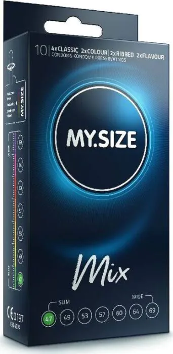 Udobni in prilagodljivi kondomi MY SIZE MIX 47 mm zagotavljajo varnost in občutljivost s svojo hipoalergeno naravno lateksno sestavo. Dodatno imajo skoraj brez vonja kar povečuje užitek med uporabo. V paketu je 10 kondomov v štirih različnih variacijah: 4 Classic, 2 Ribbed, 2 Flavour in 2 Colour.