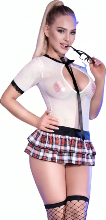 S samozavestnim izgledom ta kostum študentke zagotavlja, da boste pritegnili poglede. Oblikovan iz mehke bele mrežice, ki lepo poudari vaše obline, dopolnjen s kratko karirasto krilom za dodaten igriv pridih. Z dodatki, kot so očala in druge potrepščine, bo vaš izgled popoln za vse vrste zabav.