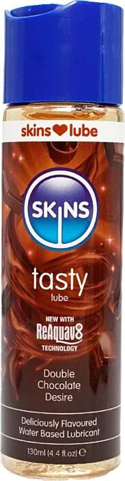 To je vodna lubrikant z okusom Dvojne Čokolade, namenjen okusnim srečanjem ali oralnim igram. Kar ga loči v trgovini, je tehnologija Skins Reaquav8: če opaziš, da se zmanjša, lahko z majhnim lizom ali pršenjem vode ponovno aktiviraš formulo in povrneš občutek drsenja. Formula je veganska, nežna in, po navedbah proizvajalca, ne pušča madežev.