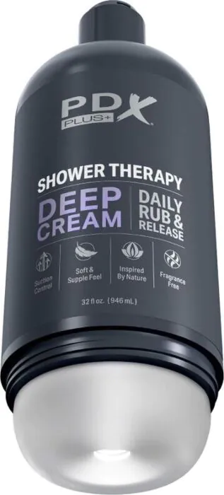 Masturbator PDX PLUS+ Deep Cream ponuja diskretno in udobno uporabo. Njegov dizajn spominja na steklenico šampona, kar ga dela idealnega za potovanje.