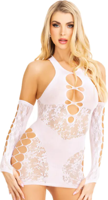 Zapeljiv minivestido iz čipke, ki poudari vašo postavo in zbudi strast. S podrobnostmi, kot so umetne hlačke in usklajene rokavice, bo ta komplet Leg Avenue poskrbel za nepozabno noč. Material 92% najlon in 8% elastan omogoča prijetno in zračno doživetje, ki vam nudi popolno svobodo gibanja.