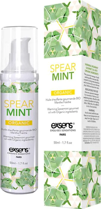 Olje za masažo Exsens s prijetnim okusom mete in učinkom toplote. Idealno za pare, ki iščejo novo dimenzijo užitka med igrami.