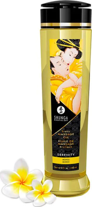 Masažno olje Shunga Serenity ponuja čutno izkušnjo z vonjem Monoi. Idealno za pare, ki si želijo sproščujočega in senzualnega masažnega Ritual. Ne pozabite na previdnost pri uporabi na belih rjuhah.