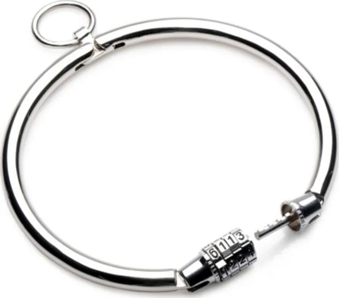 Postavite ovratnico okoli vratu svoje submisivne osebe in jo prilagodite njeni velikosti. Uporabite zaklep z kombinacijo za dodatno zaščito. Kovinska zanka omogoča dodajanje drugih igrač, kot so vrvice ali verige, za še bolj intenzivno izkušnjo. Za optimalno uporabo priporočamo uporabo lubrikanta na vodni osnovi.