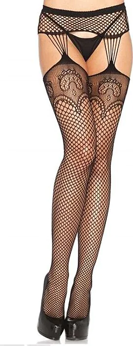 Experience a dazzling blend of allure and sophistication with these net stockings featuring a garter effect. The charming abstract motif gracefully adorns the top of the thighs, making them an enticing choice for both daytime wear and special evenings.