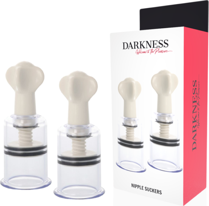 Intenzivna stimulacija bradavic s sesalcem DARKNESS. Zgrajen iz trdne plastike se enostavno prilagodi vašemu telesu, kar zagotavlja sučenje, ki povečuje vzburjenje. Vsaka škatla vsebuje dva kosa z notranjim premerom 3.1 cm, kar omogoča udobno uporabo.